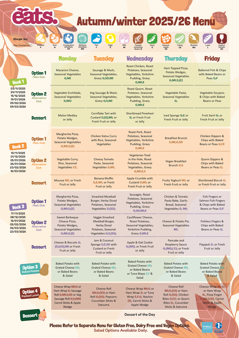 Our School Lunches are provided through EATS (East Anglian Taste for Schools) and menus are adapted for the tastes and preferences of our pupils by Head of Kitchen, Sarah Evans. We offer a variety of daily food options, including a main meal and vegetarian option, a pick and mix option (buffet style) daily vegetable choices, a salad bar, desert choices and fresh fruit. Water is served with all meals. School meals are currently £2.80. Please speak to a member of the Administration Team who will be happy to advise you on the current cost of meals.